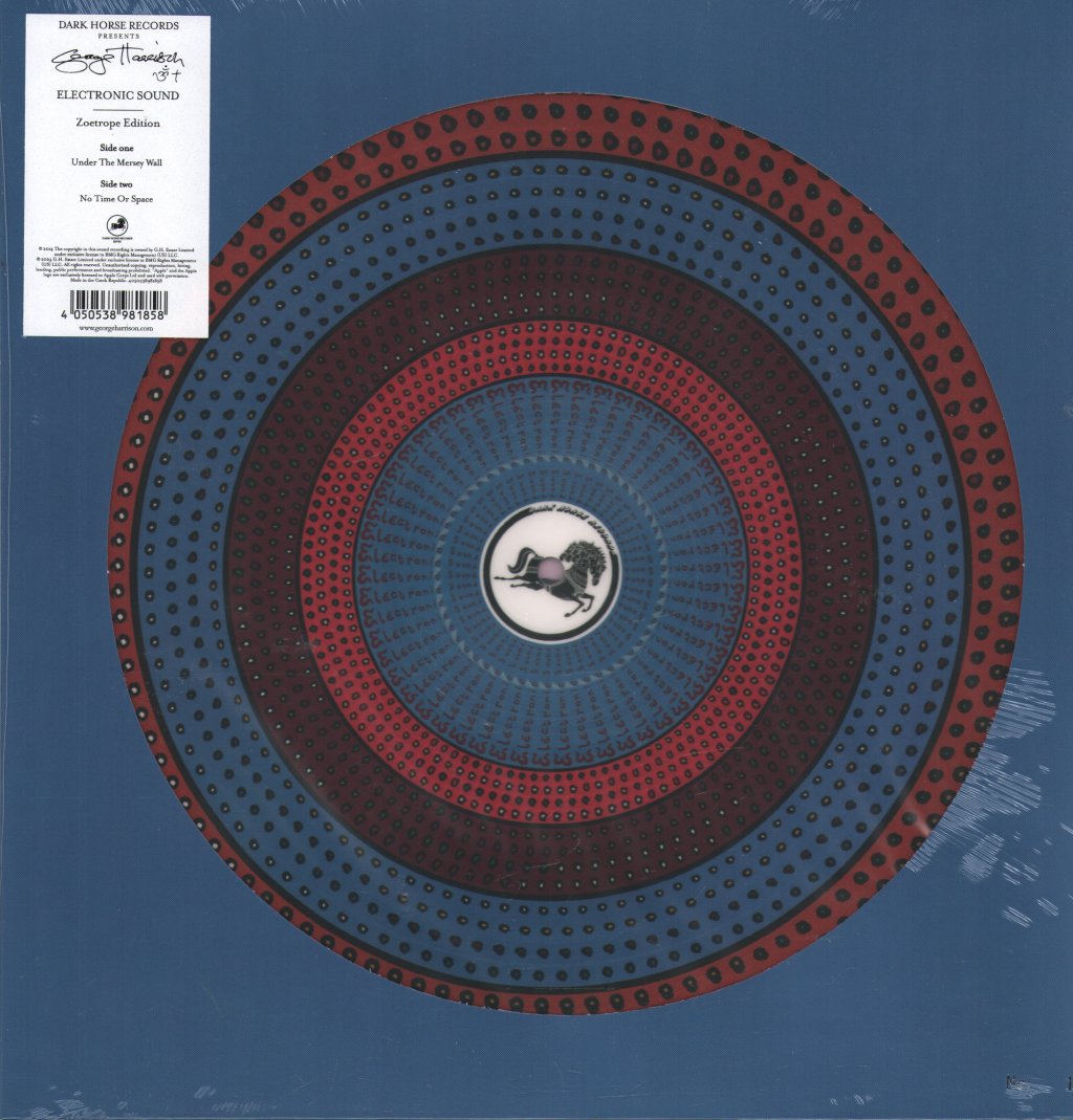 limited edition zoetrope vinyl. As a direct result of the Beatles' keen curiosity about experimental music and other avant-garde artistic expression, Apple Records launched its short-lived Zapple subsidiary in February 1969 as a forum for unfettered sonic exploration, or, as announced at the time, "more freaky sounds. " George's Electronic Sound and John Lennon and Yoko Ono's Unfinished Music No. 2: Life With the Lions, both released in May 1969, were Zapple's only releases before it was closed down. Electronic Sound's cover art, painted by George, depicts his Moog IIIp (which was later used on four tracks by the Beatles on their album Abbey Road) with the four modules from which the sound was synthesized. Each side of the Eletornic Sound LP featured one exploratory long-form work. Limited edition zoetrope initially released for RSD 2024 only, this item is now being made more widely available whilst stocks last. Each unit is individually numbered in silver foil and includes an insert reproducing the original artwork.